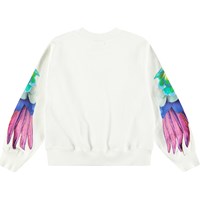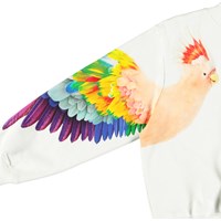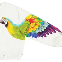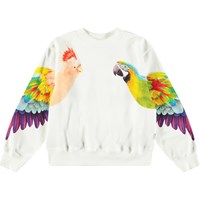 Hvid sweatshirt i blødt økologisk bomuld med ribkanter ved hals, ærmer og i bunden. Sweatshirten har en løs pasform med et farverigt print af papegøjer på hvert ærme.