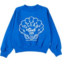 Blå sweatshirt i økologisk bomuld, med hvidt print af en muslingeskal og teksten 'Ocean Club 2024'. Sweatshirten har rund hals, ribkant ved hals, bund og ærmer samt en oversize pasform.