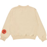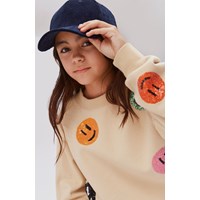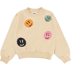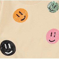 Marge er en lysegul sweatshirt med paliet smiley'er. Sweatshirten har ribkant ved hals, bund og ærme afslutning. Kombiner sweatshirten med de matchende bukser.