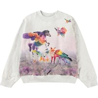Lys gråmeleret sweatshirt i økologisk bomuld med rund hals og ribkant ved hals, bund og ærmer. Sweatshirten har en oversize pasform og et print af fantasifulde og farverige dyr med vinger, der giver blusen et sjovt og livligt twist.