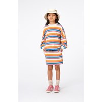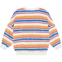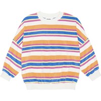 Stribet sweater i blødt bomulds frotté. Sweateren har rund hals med en hvid ribkant samt ærmer og bund. Sweateren har en løs pasform og er nem at komme i samt behagelig at have på. I den bløde bomulds frotté og de pink, orange, blå, gule og hvide striber, får man vibe til 70érne. Kombiner med nederdel i samme farve og materiale og få et komplet sæt.