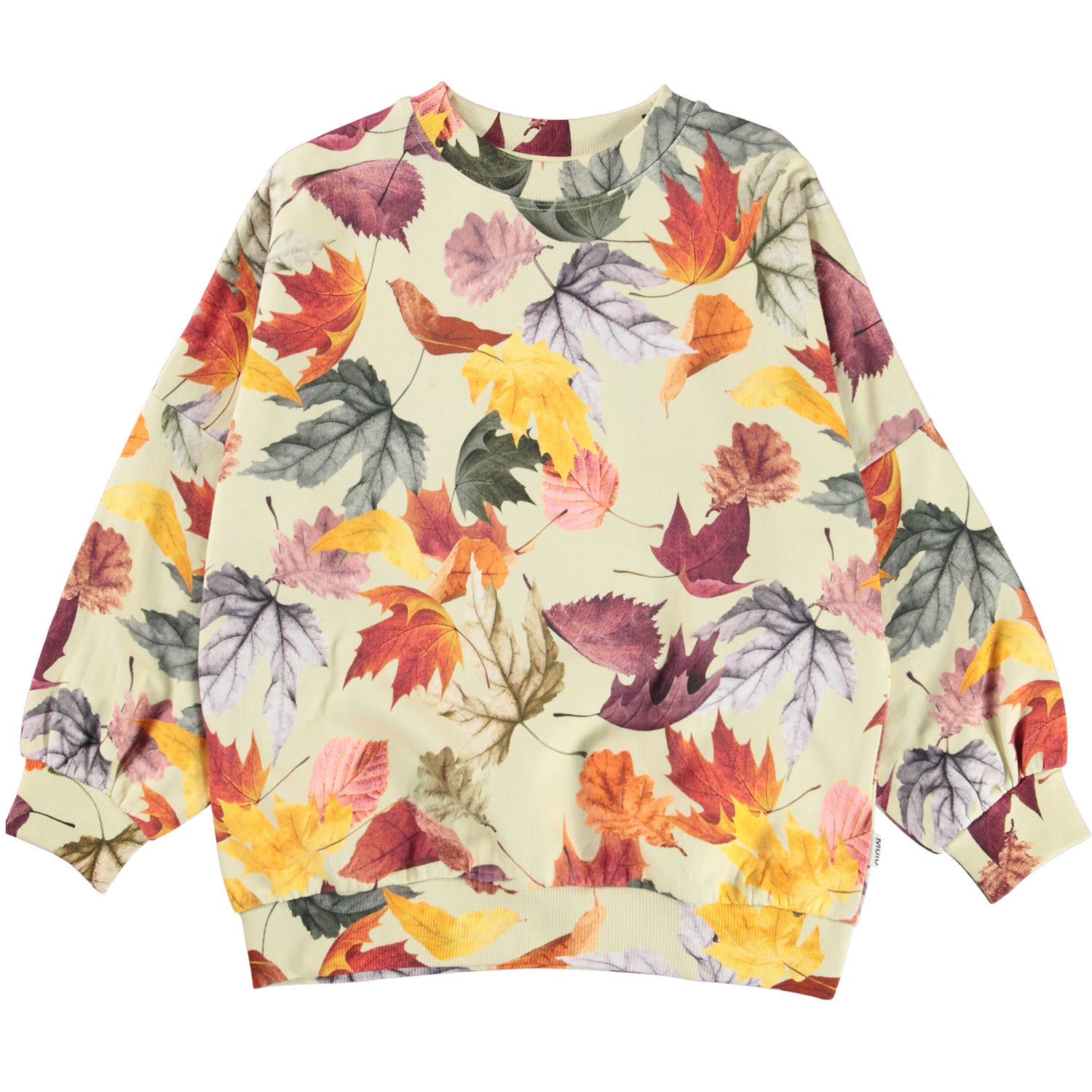 Marika er en lysegul sweatshirt med print af gyldne flotte blade. Blusen har ribkant ved hals, ærmeafslutning og bund.