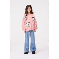 Lyserød sweatshirt i blødt økologisk bomuld med ribkanter ved hals, ærmer og i bunden. Sweatshirten har en løs pasform med palietbroderier formet som små pandaansigter.