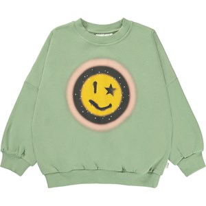 Marika er en lysegrøn sweatshirt med print af smiley på fronten, som har en stjerne i det ene øje. Blusen har ribkant ved hals, ærmeafslutning og bund.
