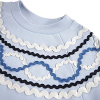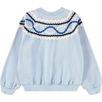 Lyseblå sweatshirt i økologisk bomuld med farvestrålende mønster af påsyede bånd. Denne sweatshirt har rund hals, raglanærmer og rib ved håndled samt i bunden.