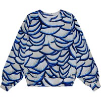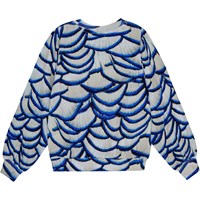 Grå sweatshirt i blødt økologisk bomuld med en ubørstet inderside, hvilket gør den dejligt kølig på en varm dag. Sweatshirten har en løs pasform, rund hals og ribkanter ved ærmerne, halsen og bunden. Den har et print af fjer i blåt, gråt og sort, som viser fjerenes flotte struktur.