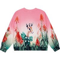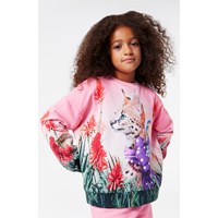 Pink sweatshirt i økologisk bomuld med rund hals og ribkanter ved ærmer, hals og bund. Løs pasform for nem påklædning og behagelig komfort. Forsiden prydes af flotte planter og orange blomster med en festklar og fancy kat, mens bagsiden har en festklar buk. Kombiner med matchende bukser for et komplet blødt jersey sæt. Børstet inderside giver en dejlig blød og varm følelse.