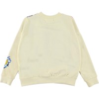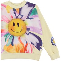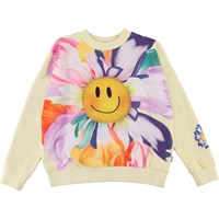 Maxi er en lysegul sweatshirt med print af smilende blomst på fronten.