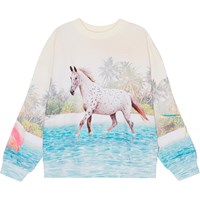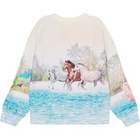 Råhvid sweatshirt i økologisk bomuld. Sweatshirten har rund hals, ribkant ved hals, bund og ærmer samt en oversize pasform. Sweatshirten har et print af galopperende heste på en Bounty strand i koralfarvet vand.