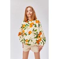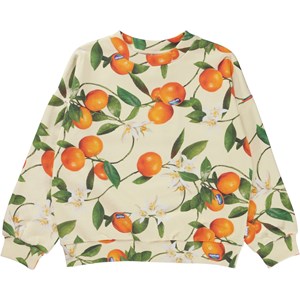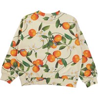Maxi er en lysegul sweatshirt fremstillet i 100% økologisk bomuld. Sweatshirten har ribkant ved hals, håndled og hofte. Maxi er allover printet, Mandarins, med ranker af orange, solmodne mandariner og mandarinblomster.