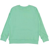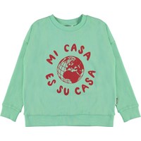 Maxi er en grøn pistancie farvet sweatshirt med rødt print af jordkloden med teksten 'Mi casa, es su casa'. Sweatshirten har en oversized pasform.  Certificeret af Ecocert Greenlife, certifikationsnr. 197496.