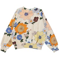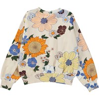 Råhvid sweatshirt med allover blomsterprint. Et simpelt grafisk print tegnet i hånden. Printet består af en masse forskellige blomster, som fx solsikker og geoginer, i lyserøde og gule nuancer. Denne sweatshirt er fremstillet i 100% bomuld, har en rund halsudskæring med ribkant, ribkant ved ærmer og hofte, samt et regulært fit. Match evt. denne sweatshirt med bukserne, Adan i samme print, for et cool look.