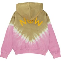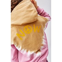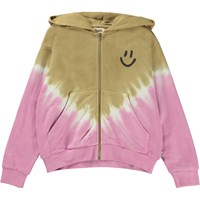 Mel er en lyserød og beige tie dye hoodie med lynlås, fremstillet i 100% økologisk bomuld. Mel har lyserød ribkant ved håndled og hofte, og har også kængurulommer. På både for og bag er der en V-formet tie dye overgang i hvid, på ryggen er printet et "Peace Now" og foran, et lille smilende ansigt.Molos tie dye print er unikt og lavet i hånden. Printet kan derfor variere fra style til style.