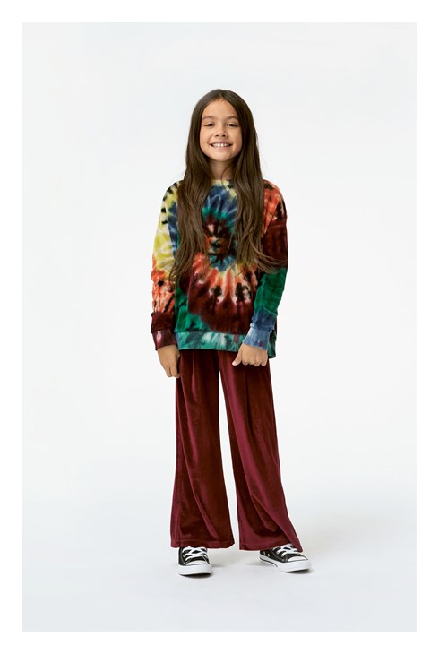 Mika er en behagelig velour sweatshirt med print af tie-dyr spiral i flotte farver. Kombiner blusen med de matchende bukser for et sejt tie-dye sæt.