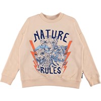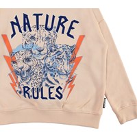 Mika er en rosa sweatshirt med print af sneleoparder på fronten, samt teksten 'Nature rules'. Sweatshirten har drop down skuldre.