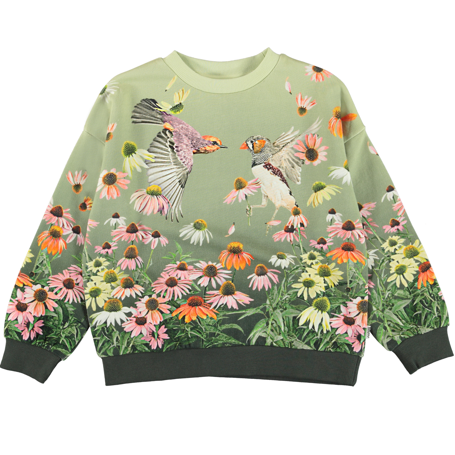 Mika er en grøn sweatshirt med print flot blomstermark og fugle.