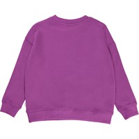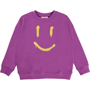 Mika er en lilla sweatshirt med en gul smiley på fronten. Blusen har en rund halsudskæring.