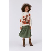 Råhvid sweatshirt med frontprint. Printet består af en hest, der står og nyder alle de smukke røde solsikker på marken. Ser du godt efter, kan du se at én af de røde solsikker er vokset ud på armen. Denne sweatshirt er fremstillet i 100% bomuld, har en rund halsudskæring med ribkant, ribkant ved ærmer og hofte, samt et loose fit.