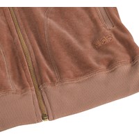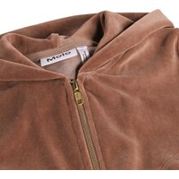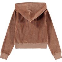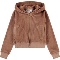 Brun hættetrøje i blød, økologisk bomuldsvelour. Trøjen har en klassisk pasform med lynlås på fronten, hætte, sidelommer og ribkanter ved ærmer og bund.
