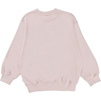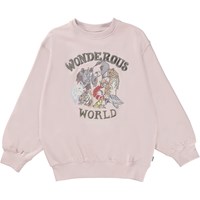 Monti er en lyserød sweatshirt med forskellige dyr broderet på forsiden, sammen med teksten "Wonderous World".