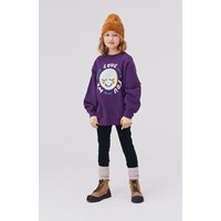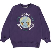 Monti er en lilla sweatshirt med print af jordklode på fronten og teksten 'we love you', som kører i ring. Sweatshirten har en oversized pasform.
