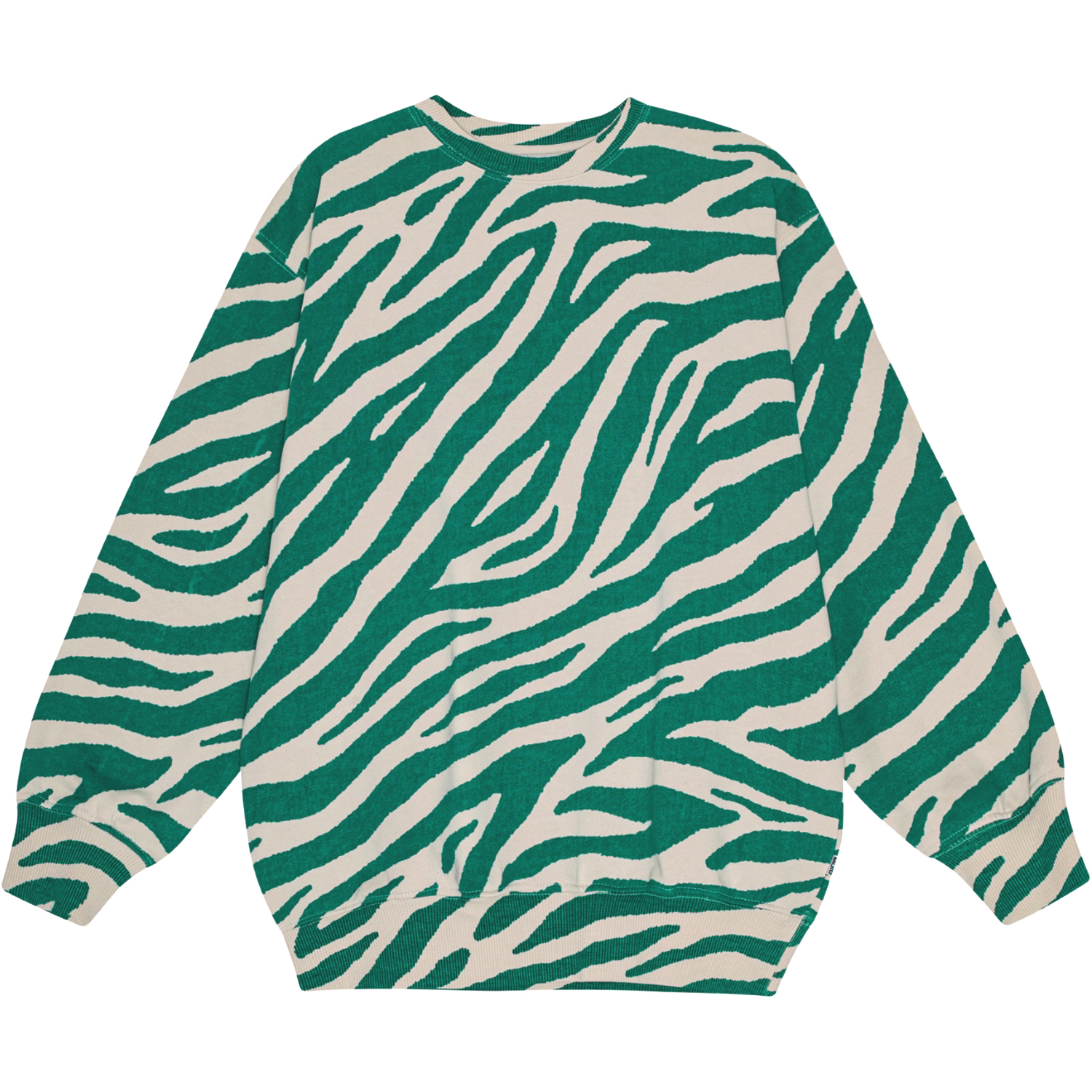 Grøn og råhvid zebrastribet sweatshirt i økologisk bomuld med en børstet inderside, der gør den dejligt blød og varm at have på. Sweatshirten har en løs pasform, rund hals med ribkanter ved ærmerne, halsen og i bunden. Sweatshirten kan kombineres med matchende bukser for et komplet sæt.