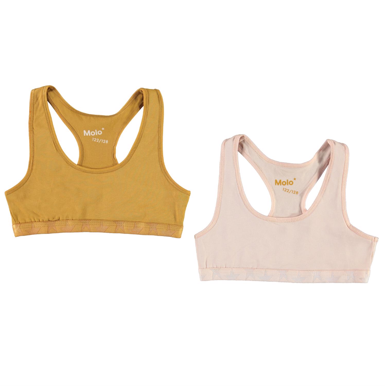 Sporty top med bryderryg og elastisk bund med stjerner, som sikrer at toppen sidder godt. Her er Jade i en 2-pack med en rosa og gul variant. Undertøjet kommer i en lille stod pose.