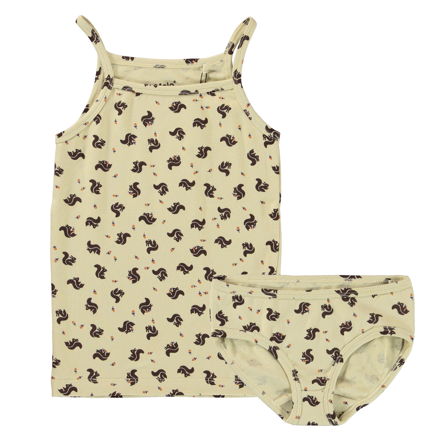 Undertøjssæt med top og underbukser i lysegul med print af små egern. Undertøjet kommer i en lille stod pose.