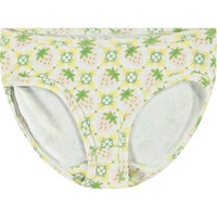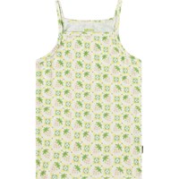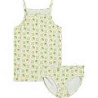 Råhvidt undertøjssæt i blødt økologisk bomuld med et allover print af lyserøde jordbær og blomster. Sættet består af en undertrøje med tynde stropper og matchende underbukser med bred elastikkant.
