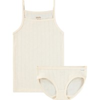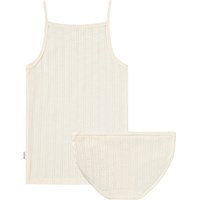 Råhvidt undertøjssæt i blød, økologisk bomuld med fint hjertemønster. Sættet består af en undertrøje med tynde stropper og matchende trusser. Begge dele har bløde kantbånd, som sikrer en behagelig og fleksibel pasform.