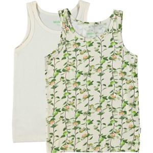 2-pack undertrøjer med brede stropper. Den ene i cremefarvet, mens den anden er i print med æbler og æblegrene.
