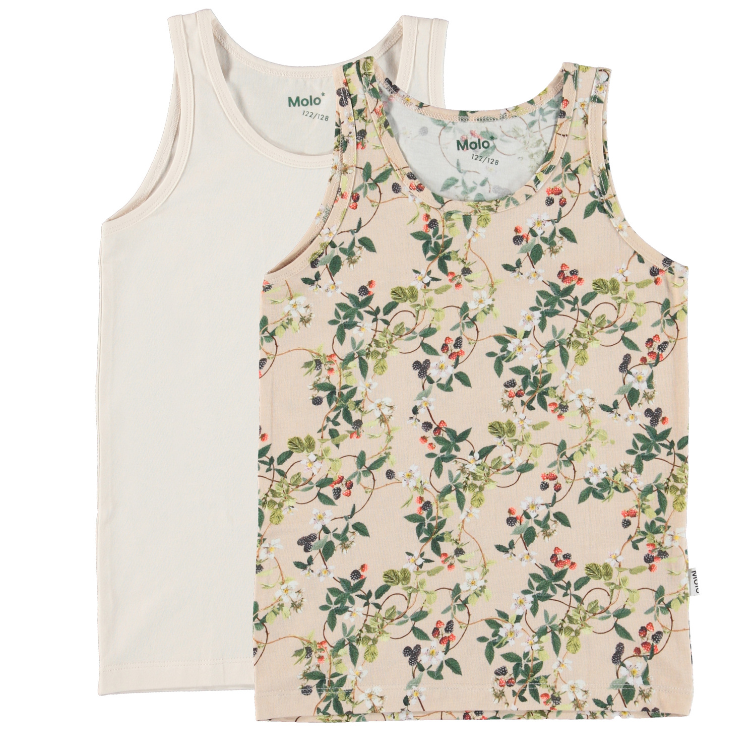 2-pack undertrøjer med brede stropper. Den ene i råhvid, mens den anden er i rosa med print af brombærranker.