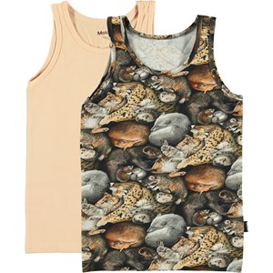 2-pack undertrøjer med brede stropper. Den ene i rosa, mens den anden er med print af forskellige sovende dyr.