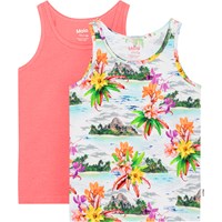 2-pak undertrøje i blødt økologisk bomuld. Undertrøjerne har brede stropper og er behagelige at have på i den bløde strækbare bomuld. Undertrøjerne er forskellige, den ene i et alloverprint af øde øer og Hawaii blomster og den anden i en frisk koral. Kombiner med matchende trusser og få et komplet sæt.