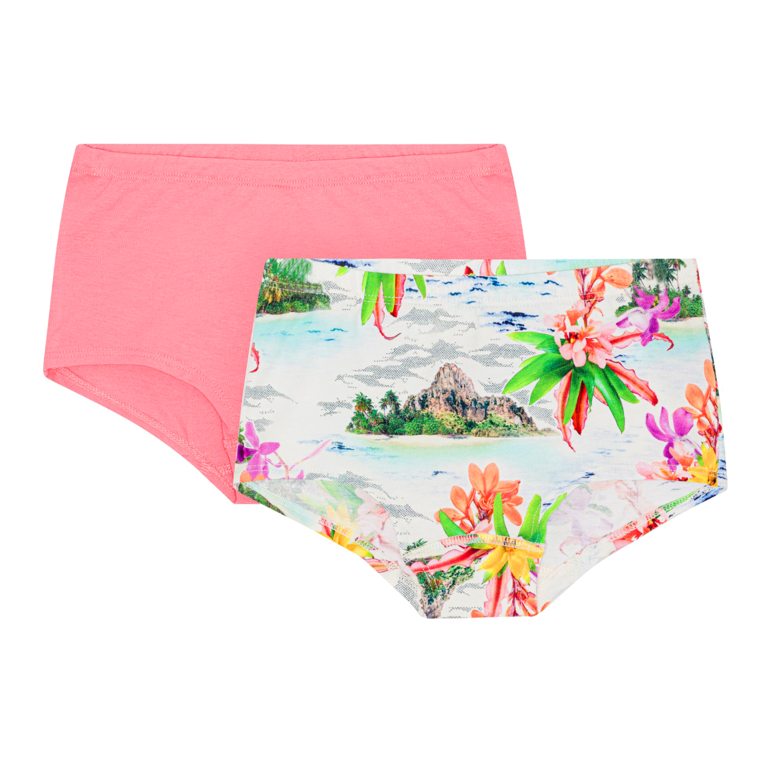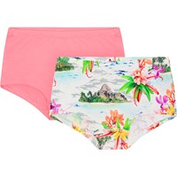 2-pak hipstertrusser i blødt økologisk bomuld. Trusserne har en bred kant samt en elastik i taljen der giver en god pasform og sidder godt. Trusserne kommer i to forskellige farver et par i lyserødt og det andet med et print af øde øer og Hawaii blomster i friske farver. Kombiner 2-pak undertrøjepakken i samme materiale og farve.