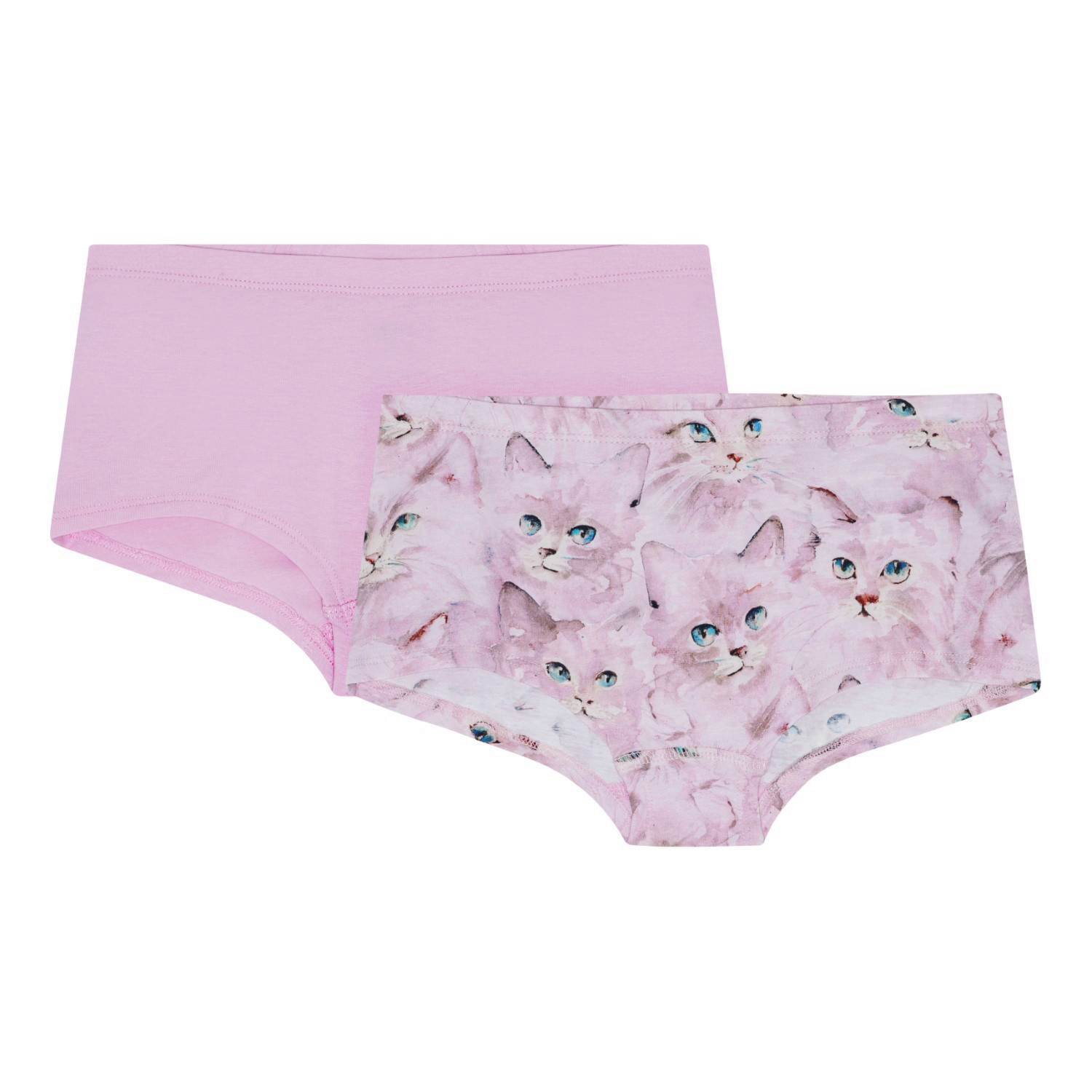 2-pak økologiske bomuldsunderbukser med lyserødt par og alloverprint af katte i lyserøde nuancer. Kombiner med matchende undertrøjer for at få et komplet sæt.