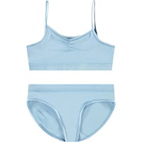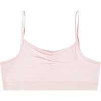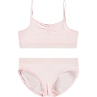 Lyserødt undertøj i blødt og strækbart viskose. Toppen har tynde elastiske stropper og en rynket syning foran, der giver toppen et flot snit. Både overdel og underdel har en bred elastikkant, der sikrer en god pasform og behagelig komfort.