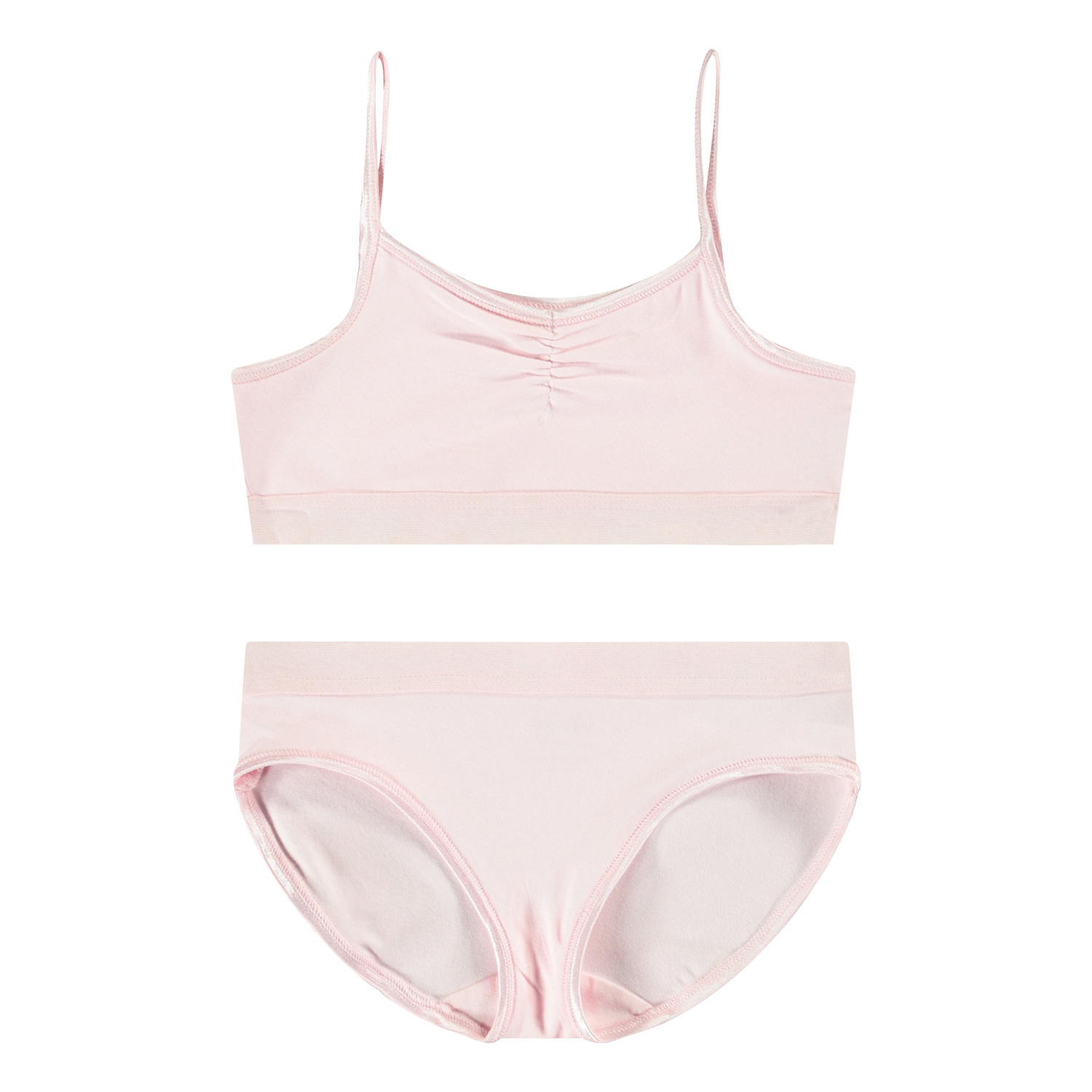 Lyserødt undertøj i blødt og strækbart viskose. Toppen har tynde elastiske stropper og en rynket syning foran, der giver toppen et flot snit. Både overdel og underdel har en bred elastikkant, der sikrer en god pasform og behagelig komfort.