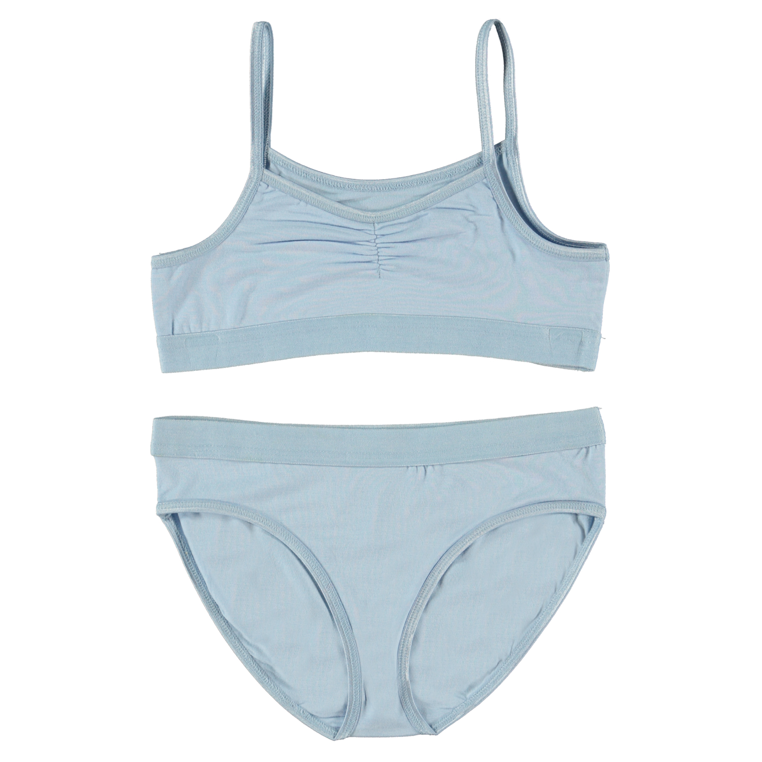 Jinny er et sæt undertøj i lyseblå, fremstillet i viskose jersey. Både overdel og underbukser har en bred elastisk kant, som sikrer en god pasform.