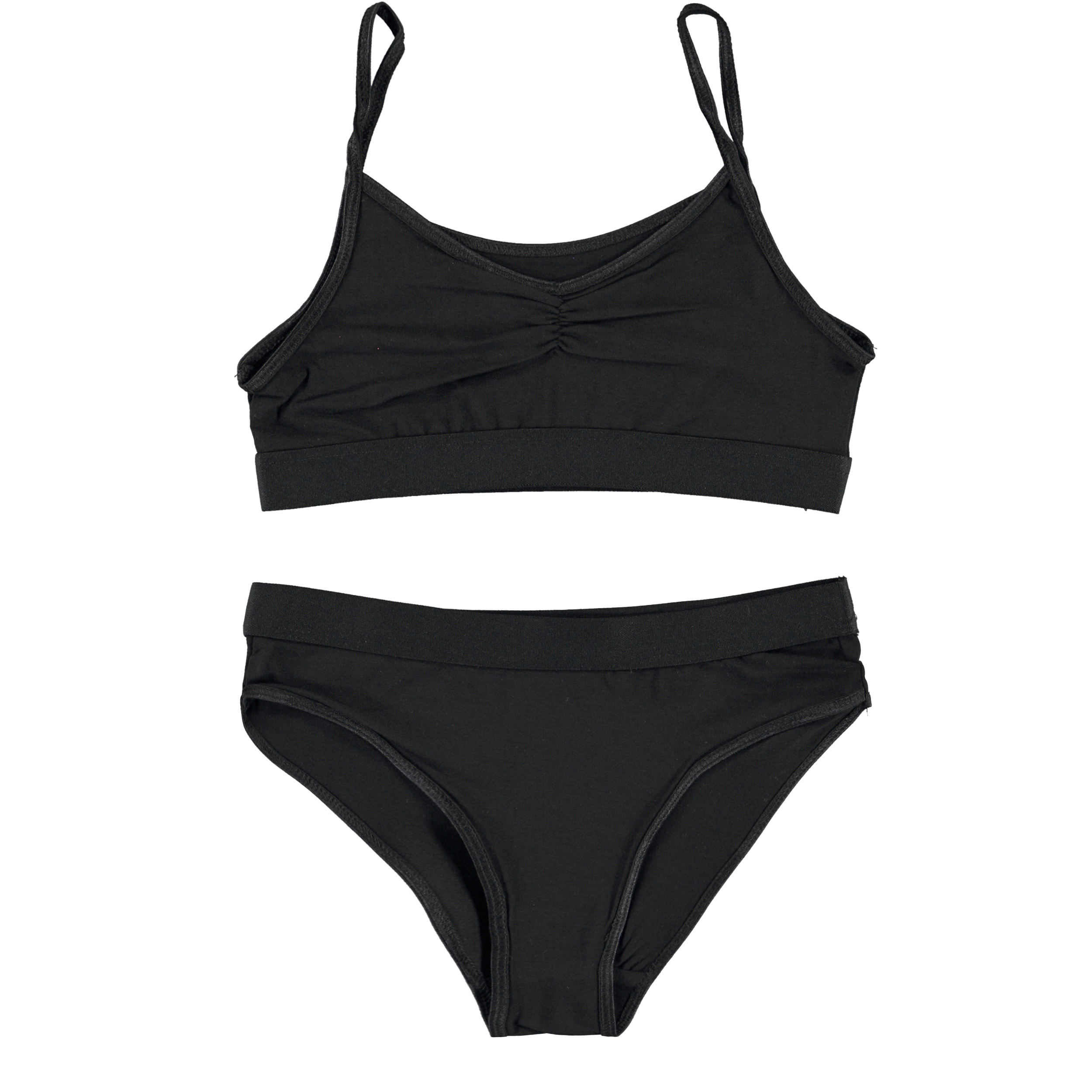 Jinny er et sæt undertøj i sort. Både overdel og underbukser har en bred sort elastisk kant, som sikrer en god pasform.